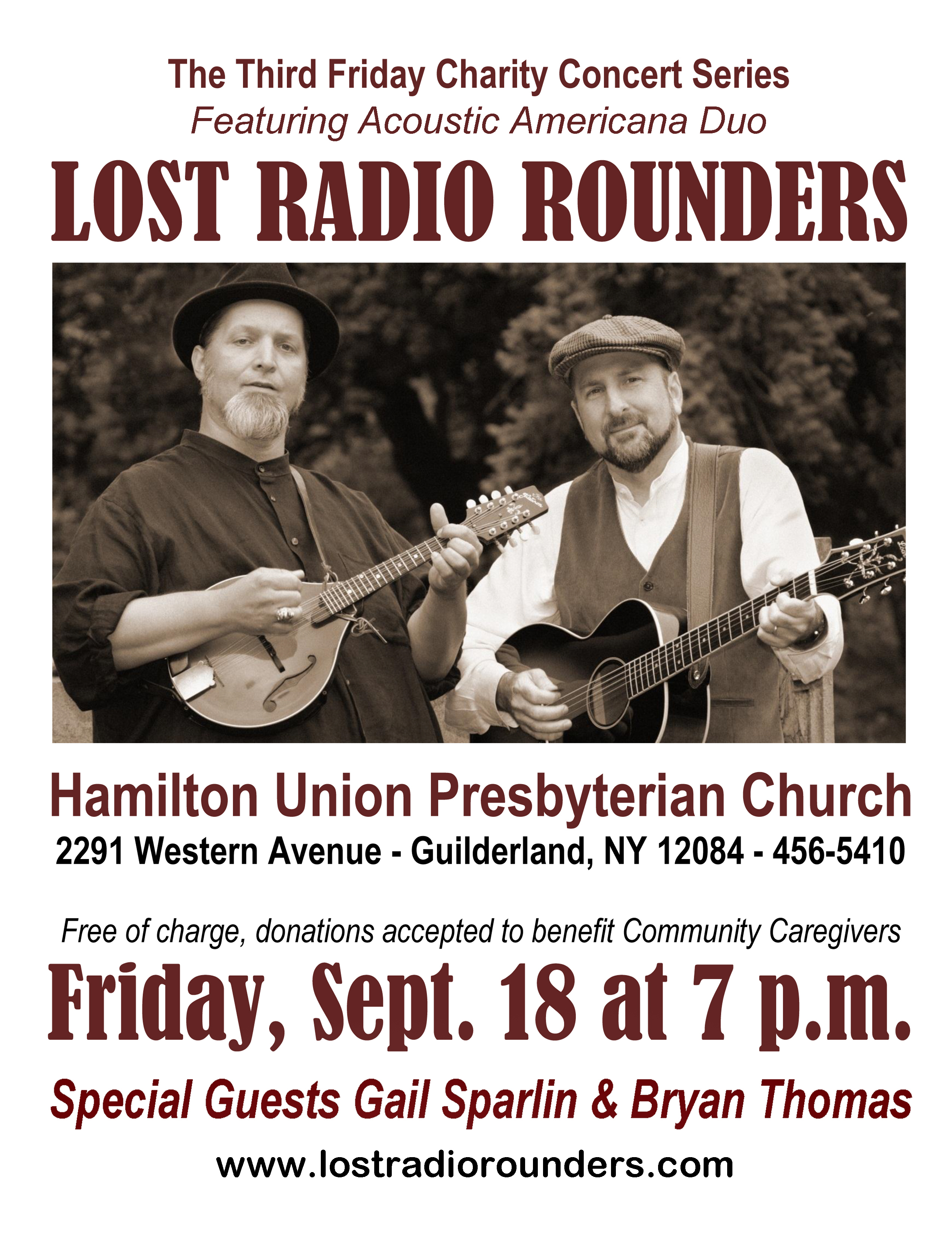 - Friday, 9/18, 7PM- Joining the Lost Radio Rounders, Third Friday Charity Concert Series Hamilton Union Presbyterian Church, 2291 Western Ave, Guilderland. View event here.